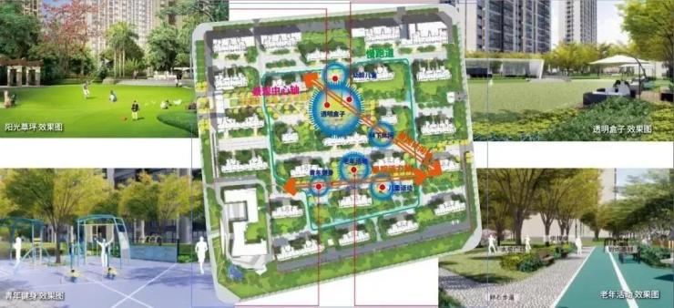 要知道,在有限的绿化空间内,极少有房企愿意花心思去做排布和设计,让小区和公园一样好逛,但项目却通过一环三轴六个生活场景的景观布局方式,以600米长的塑胶跑道为环,串联起中央景观轴、景观活力轴、景观休闲轴,于其间配置中央会客厅、幼龄儿童游乐场、全龄儿童游乐场、长者乐园、青年运动场、林下休闲等六大生活场景。