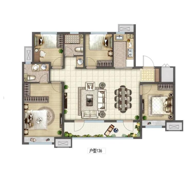 建面约136㎡四室两厅两卫户型,四房设计完全可以满足终极改善或三胎家庭居住所需,且整体空间利用率极高!