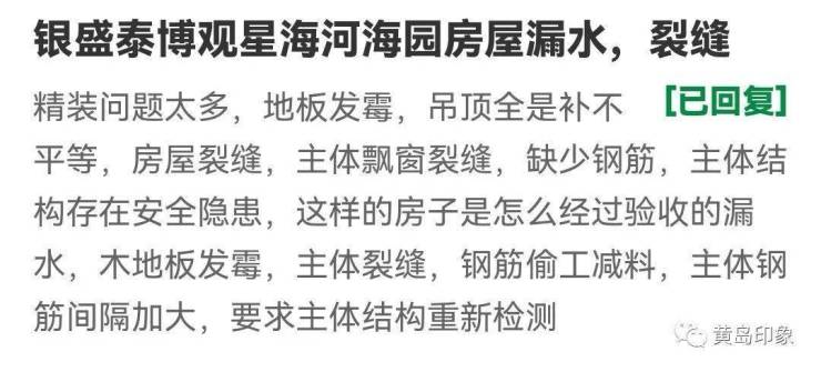 来源:黄岛印象黄岛印象小编了解到,近日,有业主投诉银盛泰博观星海河海园房屋精装问题太多,地板发霉,吊顶全是补不平等,房屋裂缝,主体飘窗裂缝,缺少钢筋,主体结构存在安全隐患,这样的房子是怎么经过验收的漏水,木地…