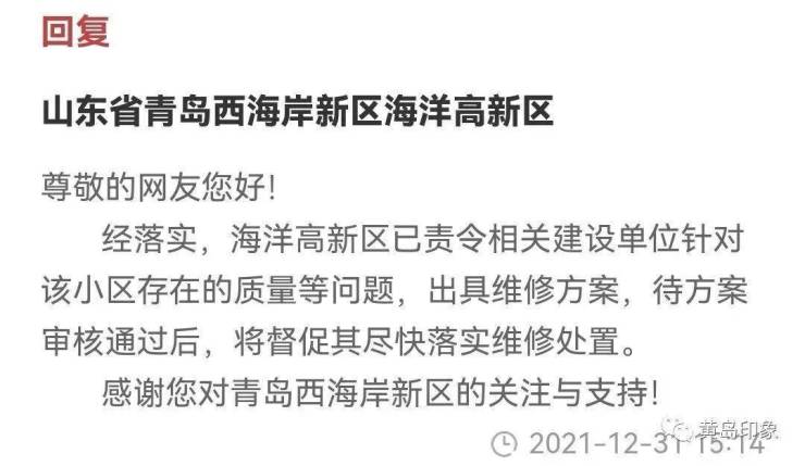 对此,青岛西海岸新区海洋高新区进行了回复称:经落实,海洋高新区已责令相关建设单位针对该小区存在的质量等问题,出具维修方案,待方案审核通过后,将督促其尽快落实维修处置。