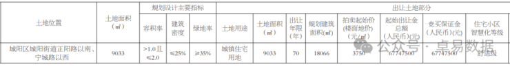 地块位于正阳路以南、宁城路以西,城镇住宅用地,占地面积9033㎡,容积率2.0,建筑面积约18066㎡,建筑密度25%,绿地率35%。起拍楼面地价3750元/㎡,总价6775万元,保证金比例100%,共6775万元。