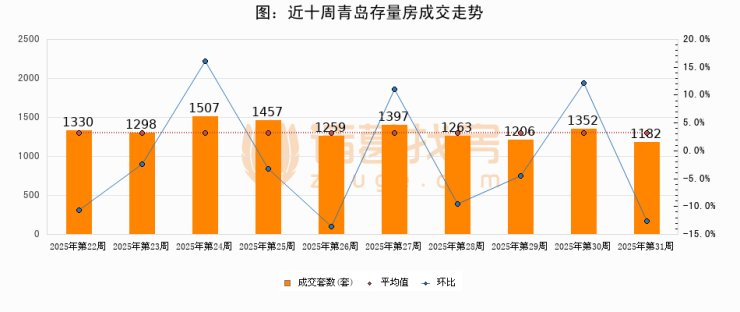 存量房方面,第31周青岛存量房成交1182套,较上周减少170套,环比下降12.6%。从近十周成交走势来看,周均成交套数为1325套,本周低于平均水平10.8%。