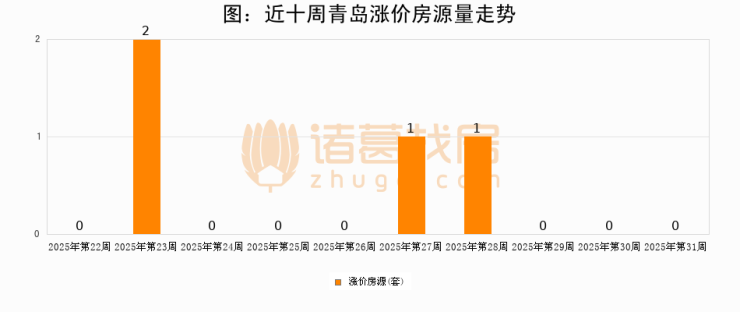 从调价房源来看,第31周青岛涨价房源0套,较上周持平。与此同时,31周涨价房源占比持平