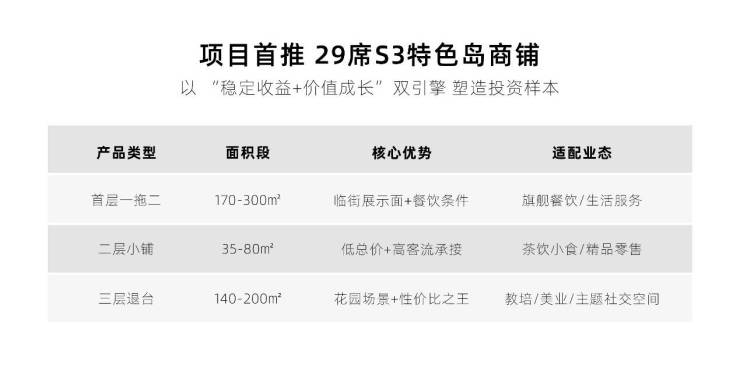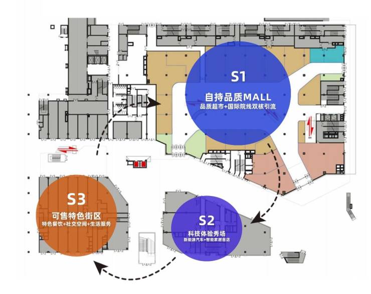 S1主岛,自持品质Mall,品质超市+国际院线双核引流;S2形象岛,定位科技体验秀场,以新能源汽车+智能家居首店为主流业态;S3特色岛,定位可售特色街区 ,聚焦特色餐饮、精品教培、茶饮小食及音乐酒吧等业态,填补区域空白。