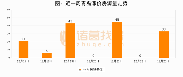 根据诸葛找房数据显示,青岛24小时涨价房源量为33套,较12月22日增加33套,环比上涨0%。与此同时,涨价房源占比小幅扩大,业主信心有所提升。