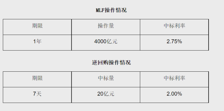 人民银行今日进行4000亿元1年期MLF操作,利率2.75%,前次为2.85%。本月有6000亿元MLF到期。
