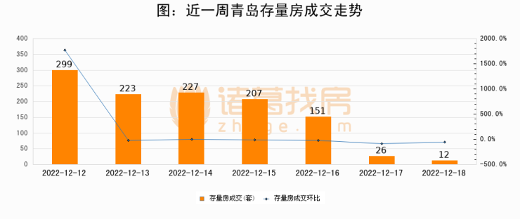 从存量房来看,2022年12月18日青岛存量房单日成交12套,比昨日减少14套,环比下降53.8%。从近一周存量房成交来看,青岛存量房日均成交套数为163套,其中12月12日成交量最高为299套,12月18日单日成交12套,低于近一周平均水平92.6%。
