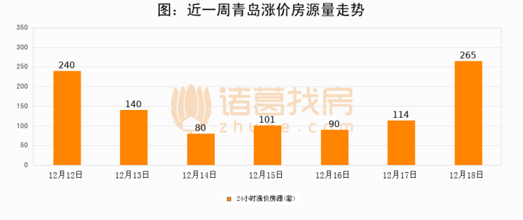 根据诸葛找房数据显示,青岛24小时涨价房源量为265套,较12月17日增加151套,环比上涨132.5%。与此同时,涨价房源占比小幅扩大,业主信心有所提升。
