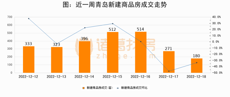 根据青岛市住房和城乡建设局数据显示,2022年12月18日青岛新建商品房成交180套,较昨日减少91套,环比下降33.6%。近一周青岛新建商品房日均成交362套,其中,12月16日成交量最高为514套。12月18日单日成交180套,低于近一周平均水平50.3%。