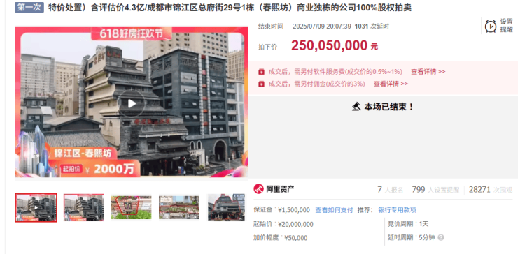 7月9日,据阿里资产网披露的信息显示,成都市锦江区总府街29号1栋(春熙坊)商业独栋的公司100%股权以约2.5亿元成交,起拍价为2000万元,评估价为4.3亿元。