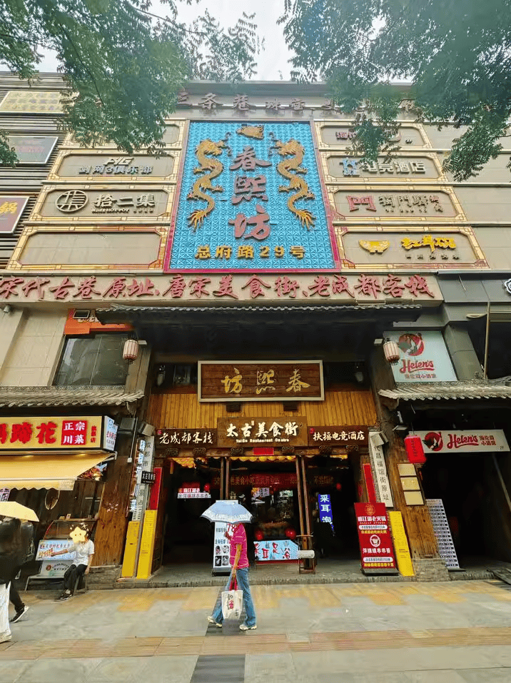 据成都日报报道,成都春熙坊自2013年开业以来,经营方向历经多次调整。2013年9月,春熙坊首个开业的“唐宋美食街”定位为还原老成都“昌福馆街”美食文化,开街后迅速成为热门景点,汇集川味小吃及国际餐饮,并设川剧变脸表演。第二年,新增“老成都三条巷”(招财巷、进宝巷、淘宝巷),引入古玩、银器、书画等民俗商业,并首创夜间营业模式,开街的新奇带来人流如潮。