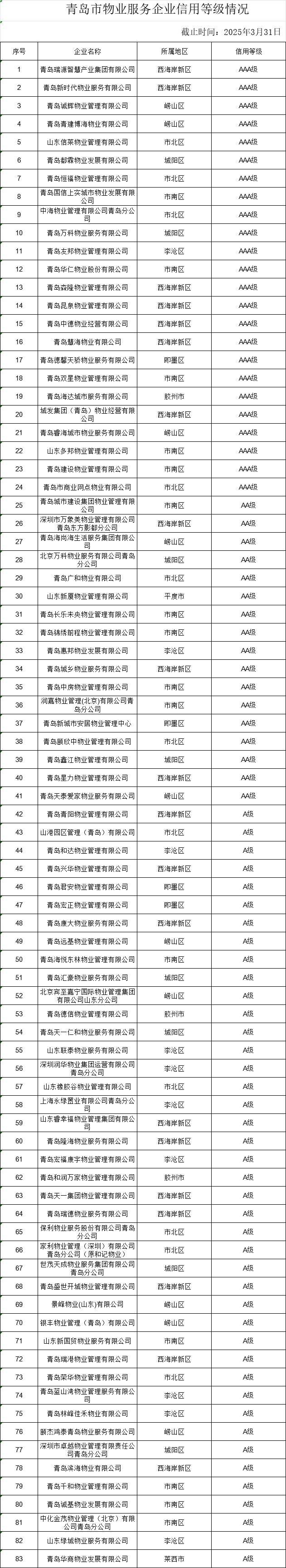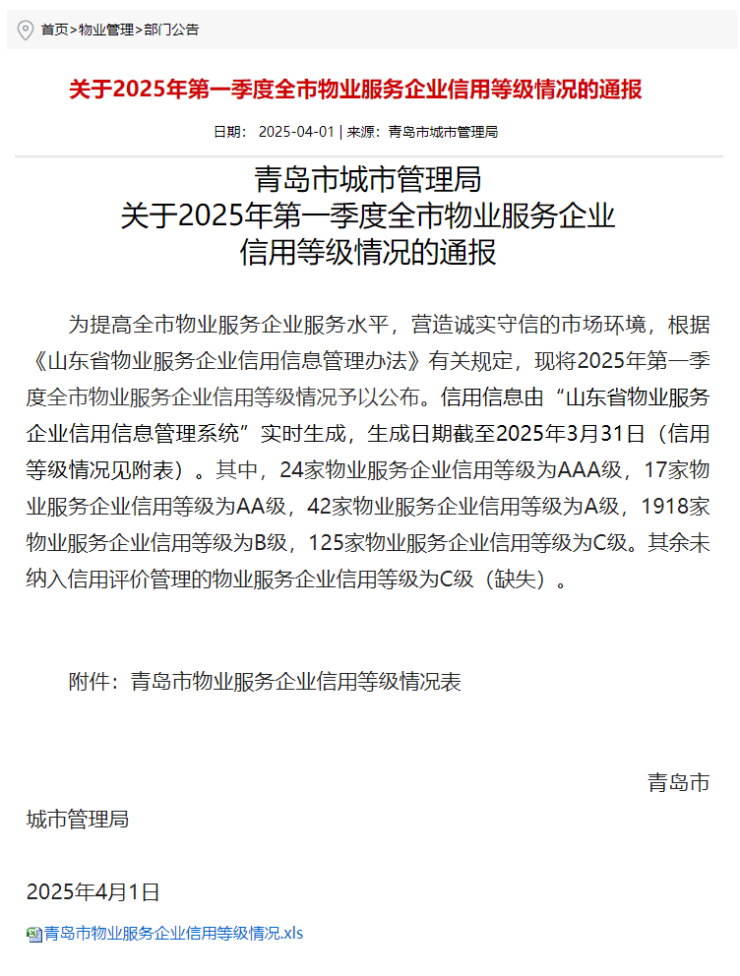 为提高全市物业服务企业服务水平,营造诚实守信的市场环境,根据《山东省物业服务企业信用信息管理办法》有关规定,现将2025年第一季度 全市物业服务企业信用等级情况予以公布。 信用信息由“山东省物业服务企业信用信息管理系统”实时生成,生成日期截至2025年3月31日(信用等级情况见附表)。 其中, 24家物业服务企业信用等级为AAA级,17家物业服务企业信用等级为AA级,42家物业服务企业信用等级为A级,1918家物业服务企业信用等级为B级,125家物业服务企业信用等级为C级。其余未纳入信用评价管理的物业服务企业信用等级为C级(缺失)。