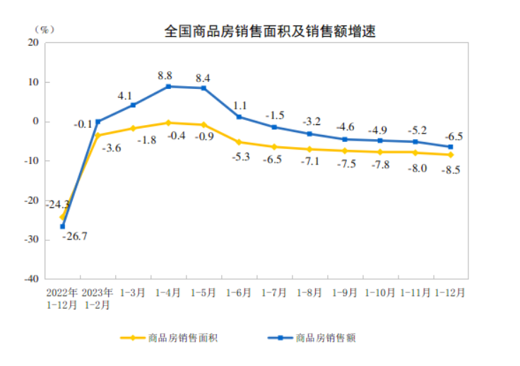 从销售情况看,2023年,商品房销售面积111735万平方米,比上年下降8.5%,其中住宅销售面积下降8.2%。商品房销售额116622亿元,下降6.5%,其中住宅销售额下降6.0%。