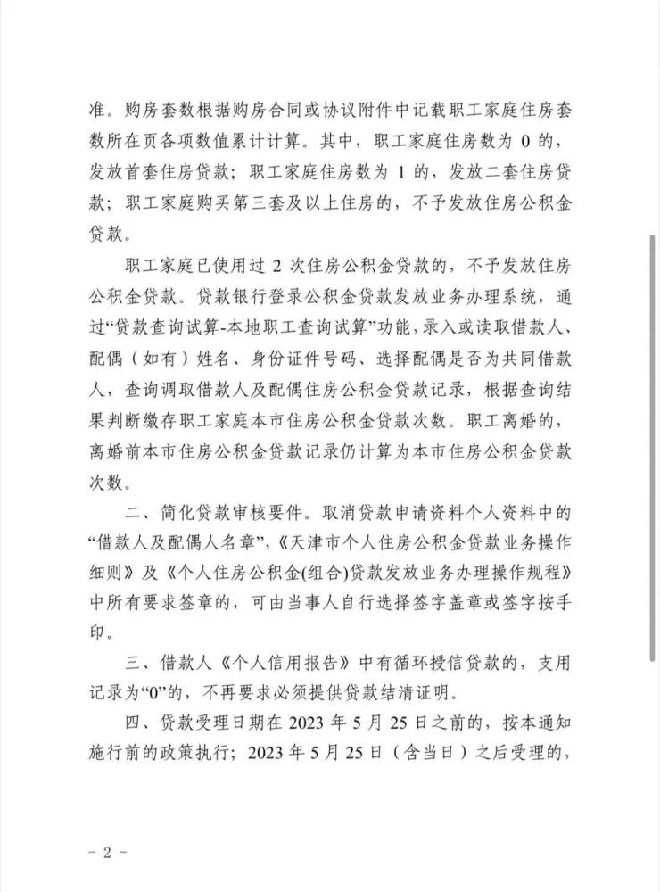 《通知》包括调整套数核定标准、简化贷款审核要件等内容。贷款受理日期在2023年5月25日之前的,按《通知》施行前的政策执行;2023年5月25日(含当日)之后受理的按《通知》执行。贷款受理日期为贷款银行向天津市住房公积金管理中心提交职工贷款申请之日。