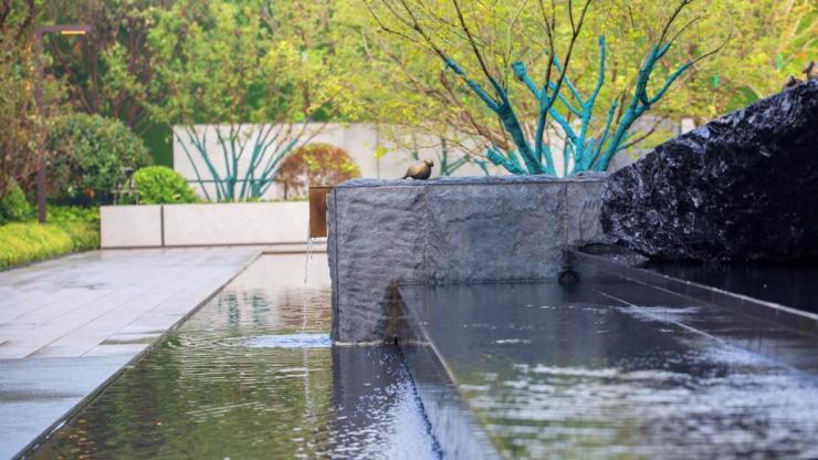 龙湖造园始终坚持根植于地域与历史,传承当地文化,延续人文情怀。蓝岸郦城提取崂山“山水”元素,设置对景+水景组合,搭配花乔植物组团,将樱花植于主轴两侧,让业主时时感受归家的温暖与仪式感。园区采用九水清溪水景主题,再现崂山北九水风貌。水系蜿蜒流畅,植物穿插其间,于亲水廊架栈道间,尽赏水景之灵动。