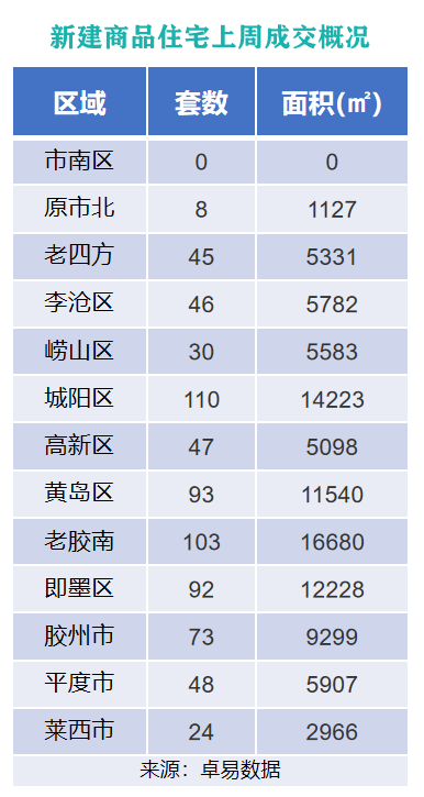 从各区成交情况来看,上周原胶南市新建商品住宅以成交面积16680㎡的成绩,位列上周各片区新建商品住宅成交面积榜首位;城阳区以成交面积14223㎡的成绩,位列成交面积榜第二位;即墨区以成交面积12228㎡的成绩,位列成交面积榜第三位。
