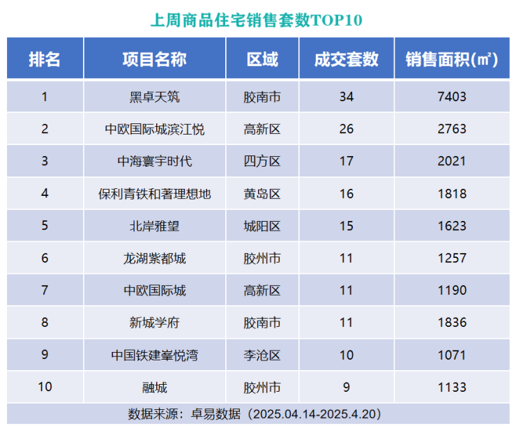 从各项目成交套数来看,位于西海岸新区的黑卓天筑以成交34套的成绩列榜单首位;位于高新区的中欧国际城滨江悦以成交26成绩上榜第二位;位于市北区的中海寰宇时代以成交17套的成绩列榜单第三位。