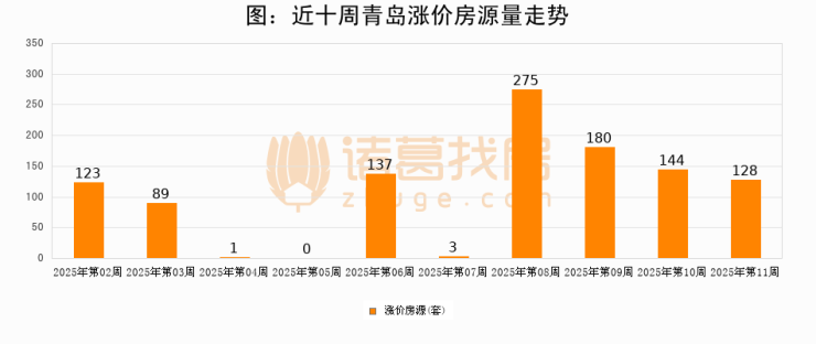 从调价房源来看,第11周青岛涨价房源128套,较上周下降11.1%。与此同时,11周涨价房源占比回落0.83个百分点,业主信心小幅波动,购房者可则需入市。