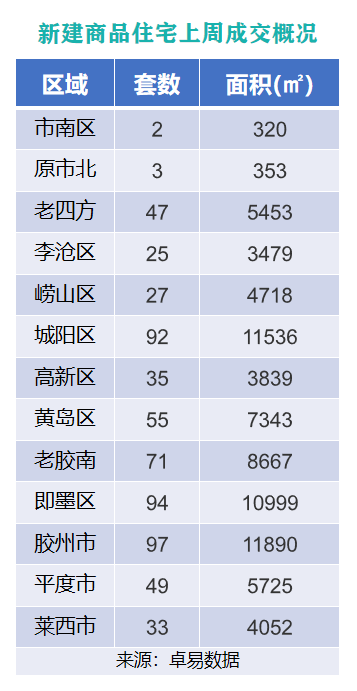 从各区成交情况来看,上周胶州市新建商品住宅以成交面积11890㎡的成绩,位列上周各片区新建商品住宅成交面积榜首位;城阳区以成交面积11536㎡的成绩,位列成交面积榜第二位;即墨区以成交面积10999㎡的成绩,位列成交面积榜第三位。