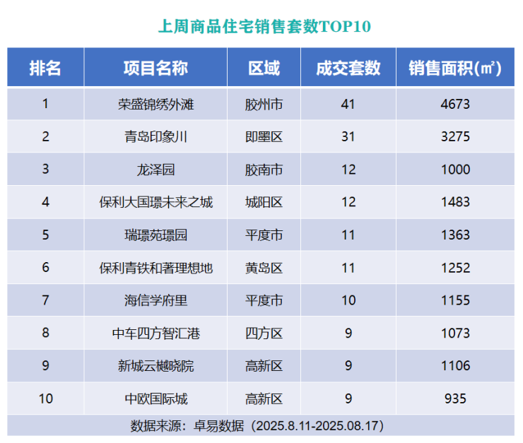 从各项目成交套数来看,位于胶州市的荣盛锦绣外滩以成交41套的成绩列榜单首位;位于即墨区的青岛印象川以成交31成绩上榜第二位;位于西海岸新区的龙泽园以成交12套的成绩列榜单第三位。