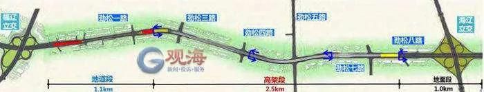 工程自福州路-辽阳路立交以东利用现状地势下穿,过劲松一路后爬升至地面,向东采用双向六车道高架桥上跨劲松三、四、五、六、七路后落地,以地面快速路形式接入海尔路-辽阳路立交。在劲松三路西侧、劲松四路东侧、劲松五路东侧、海尔路立交西侧设置4对匝道进出高架主线。