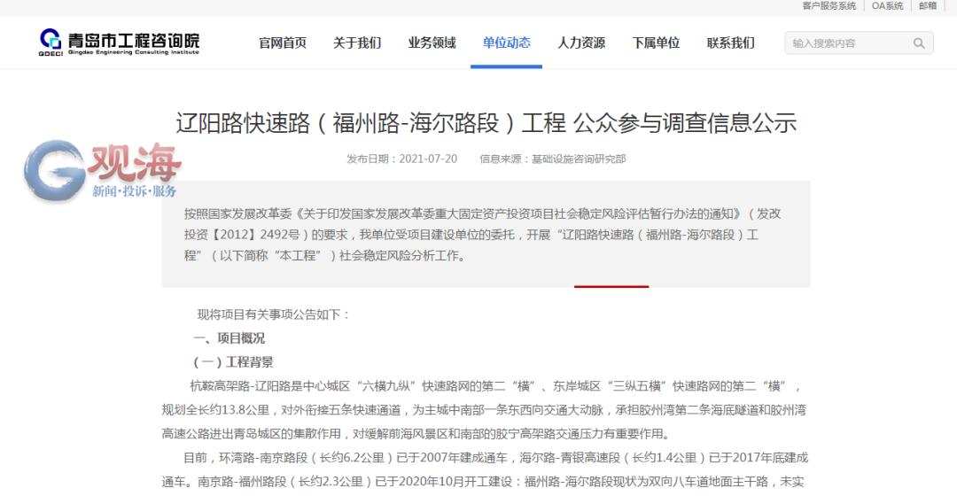 受项目建设单位的委托,青岛市工程咨询院开展了“辽阳路快速路(福州路-海尔路段)工程”社会稳定风险分析工作,该工程公众参与调查信息公示今天发布,意味着该项目距离开工建设又近了一步。