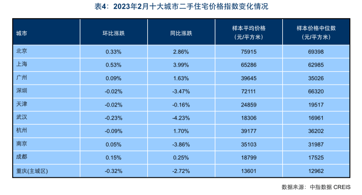 从涨跌城市个数看,根据中国房地产指数系统百城价格指数,2023年2月,26个城市新建住宅价格环比上涨,45个城市环比下跌,29个城市持平。二手住宅方面,31个城市二手住宅价格环比上涨,68个城市环比下跌,1个城市持平。