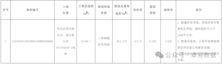 地块位于市北区郑州路以北、商丘路以东SF1203039-1地块,占地21548.1㎡,容积率2.0,总建面约4.3㎡,建筑密度≤20%,绿地率≥35%,其中需要配建农贸市场不低于1500㎡。
