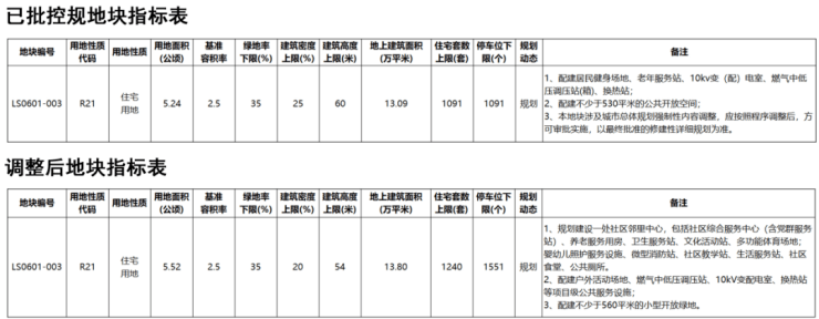 宗地四至进行了调整,调整后地块占地面积5.52万㎡,容积率2.5,地上建面13.8万㎡,住宅上限1240套,规划停车位下限1240个。