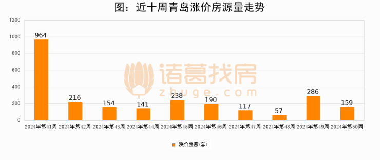 从调价房源来看,第50周青岛涨价房源159套,较上周下降44.4%。与此同时,50周涨价房源占比回落0.63个百分点,业主信心小幅波动,购房者可则需入市。