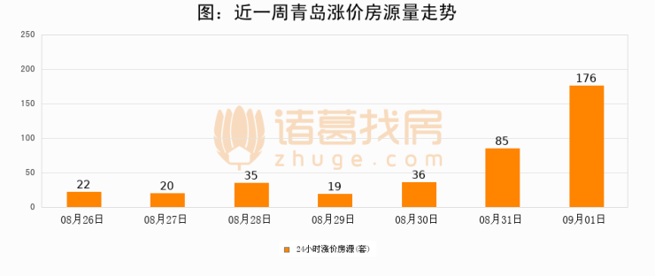 根据诸葛找房数据显示,青岛24小时涨价房源量为176套,较08月31日增加91套,环比上涨107.1%。与此同时,涨价房源占比小幅扩大,业主信心有所提升。