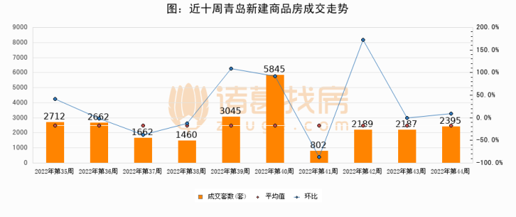 进入2022年第44周(10月24日-10月30日),青岛新建商品房成交2395套,较上周增加208套,环比上涨9.5%