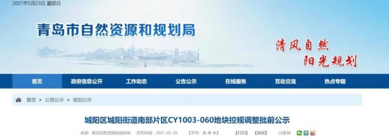 地块位于城阳区城阳街道崇阳路以南、宁城路以东、青新高速以西。公示介绍,为进一步推进城阳区高质量发展,结合城阳区发展需求,现拟对青岛市人民政府已批复的《青岛市城阳区城阳街道南部片区控制性详细规划》(青政函 [2019] 135号)中部分地块规划指标进行调整。