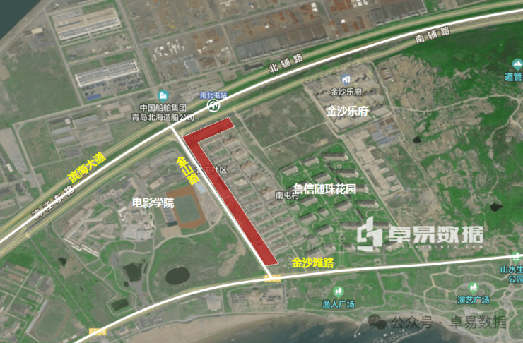 四至东至金沙滩路,南至金沙滩路,西至金山路,北至漓江东路。南侧为金沙滩区域,北侧滨海大道且紧邻地铁1号线南北屯站,西侧与电影学院相邻,东侧有鲁信随珠花园。