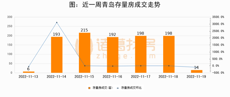从存量房来看,2022年11月19日青岛存量房单日成交14套,比昨日减少184套,环比下降92.9%。从近一周存量房成交来看,青岛存量房日均成交套数为145套,其中11月15日成交量最高为215套,11月19日单日成交14套,低于近一周平均水平90.3%。