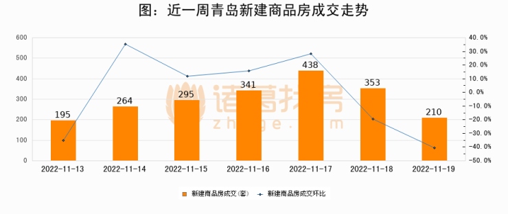 根据青岛市住房和城乡建设局数据显示,2022年11月19日青岛新建商品房成交210套,较昨日减少143套,环比下降40.5%。近一周青岛新建商品房日均成交300套,其中,11月17日成交量最高为438套。11月19日单日成交210套,低于近一周平均水平30%。