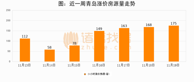 根据诸葛找房数据显示,青岛24小时涨价房源量为175套,较11月18日增加7套,环比上涨4.2%。与此同时,涨价房源占比小幅扩大,业主信心有所提升。