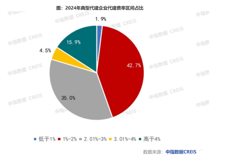 据中指研究院对典型代建企业代建项目的统计,77.7%的代建项目代建费率在1%~3%之间,其中,42.7%的项目代建费率在1%~2%之间,占比最高。“近年来,随着代建企业竞争加剧,代建费率持续压缩,预计该趋势未来还将延续。”