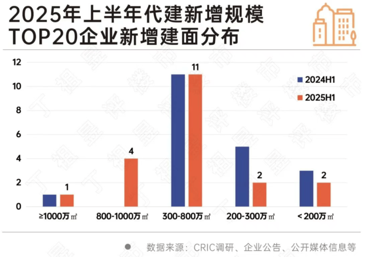 在TOP20代建企业中,有11家企业的新增签约建筑面积在300万~800万平方米区间,5家企业超过800万平方米。对比来看,上半年新增签约建筑面积超300万平方米的代建企业数量明显高于去年同期,“强者恒强”局面明显。