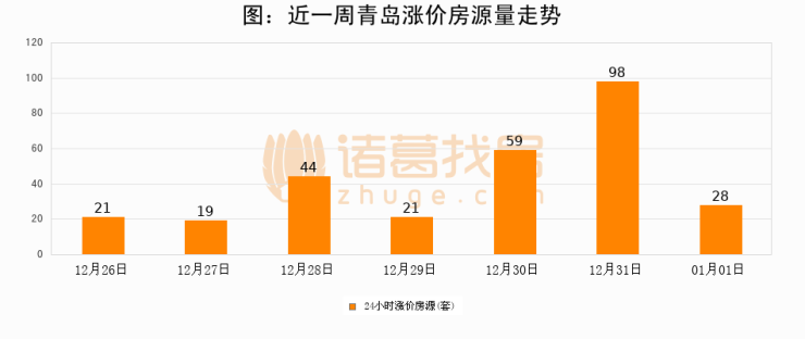 根据诸葛找房数据显示,青岛24小时涨价房源量为28套,较12月31日减少70套,环比下降71.4%。与此同时,涨价房源占比小幅回落,对于购房者来说是一个入市窗口期,购房者可抓住时机入市。