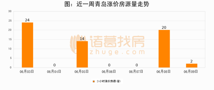 根据诸葛找房数据显示,青岛24小时涨价房源量为2套,较06月08日减少18套,环比下降90%。与此同时,涨价房源占比小幅回落,对于购房者来说是一个入市窗口期,购房者可抓住时机入市。