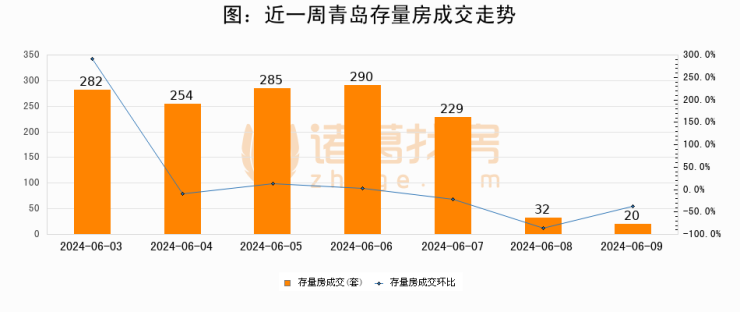 从存量房来看,2024年06月09日青岛存量房单日成交20套,比昨日减少12套,环比下降37.5%。从近一周存量房成交来看,青岛存量房日均成交套数为198套,06月09日单日成交20套,低于近一周平均水平89.9%。