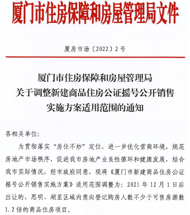 近日,厦门市住房保障和房屋管理局印发《关于调整新建商品住房公证摇号公开销售实施方案适用范围的通知》,规定岛内新房项目意向登记购房人数不少于可售房源数1.2倍,岛外项目不再强调摇号。