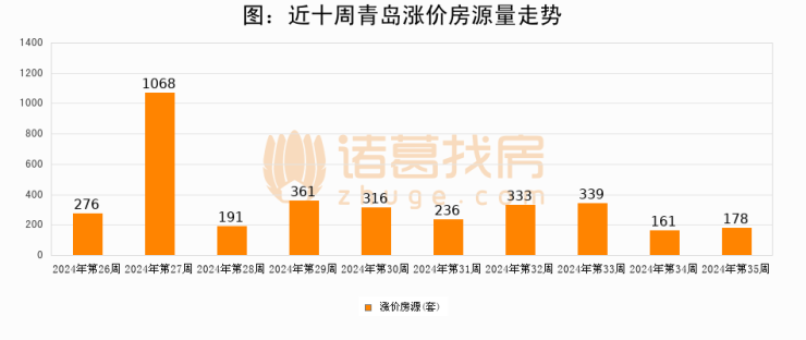 从调价房源来看,第35周青岛涨价房源178套,较上周上涨10.6%。与此同时,35周涨价房源占比提升0.79个百分点,业主信心持续恢复。