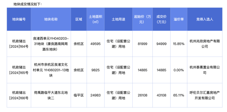 此次余杭区推出的另一宗地块为杭政储出[2024]165号地块,即杭州市余杭区良渚文化村单元YH060201-13地块,该地块东至相邻用地,南至大陆路,西至相邻用地,北至相邻用地。地块的出让土地面积为9825平方米,出让地上建筑面积为9923.25平方米,出让起始价14885万元,折合起始楼面价15000元/平方米。地块成交信息显示,该地块最终由杭州泰熹置业有限公司以底价摘得。