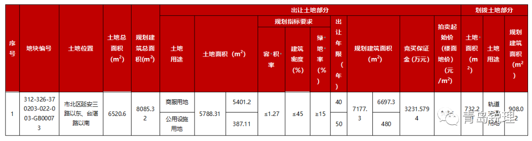 2月22日,青岛青铁商业发展有限公司以底价获得市北区延安三路以东、台湛路以南1宗商服+公用设施用地,成交楼面地价9005元/㎡,成交总价0.65亿。