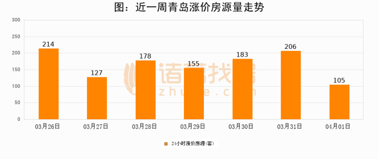 根据诸葛找房数据显示,青岛24小时涨价房源量为105套,较03月31日减少101套,环比下降49%。与此同时,涨价房源占比小幅回落,对于购房者来说是一个入市窗口期,购房者可抓住时机入市。