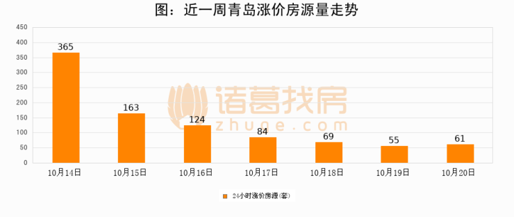 根据诸葛找房数据显示,青岛24小时涨价房源量为61套,较10月19日增加6套,环比上涨10.9%。与此同时,涨价房源占比小幅扩大,业主信心有所提升。