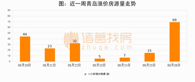 根据诸葛找房数据显示,青岛24小时涨价房源量为69套,较08月25日增加54套,环比上涨360%。与此同时,涨价房源占比小幅扩大,业主信心有所提升。