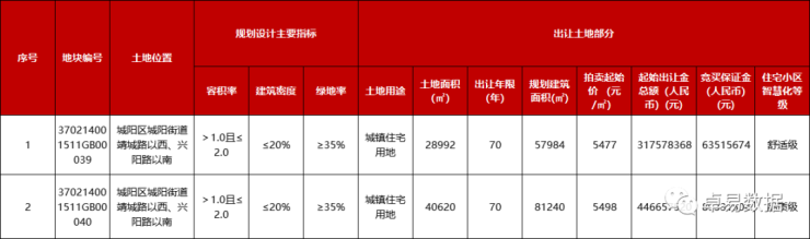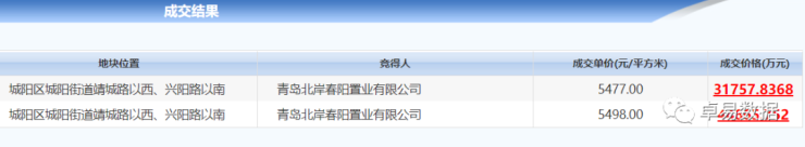 12月28日,城阳区城阳街道青春足球场西2宗地底价成交,2宗地最后被青岛北岸春阳置业有限公司收入囊中2宗地块占地面积69612㎡,建面约13.92万㎡,总价7.64亿。